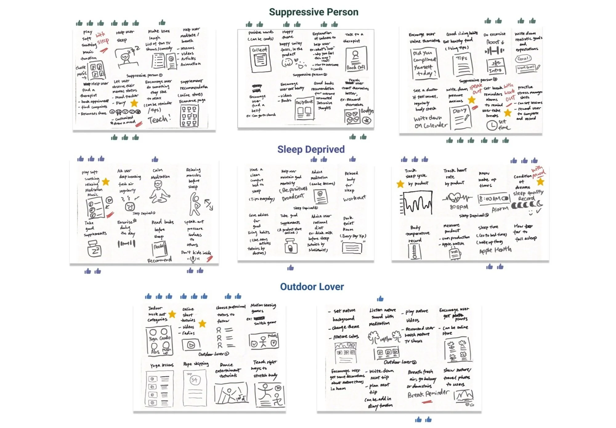 While interviewing and discovering problems, I also got feature suggestions and inspiration from my interviewees (health workers) referred decompression methods and knowledge of professional treatment. Therefore, I returned to the affinity map and put together all the solution ideas.