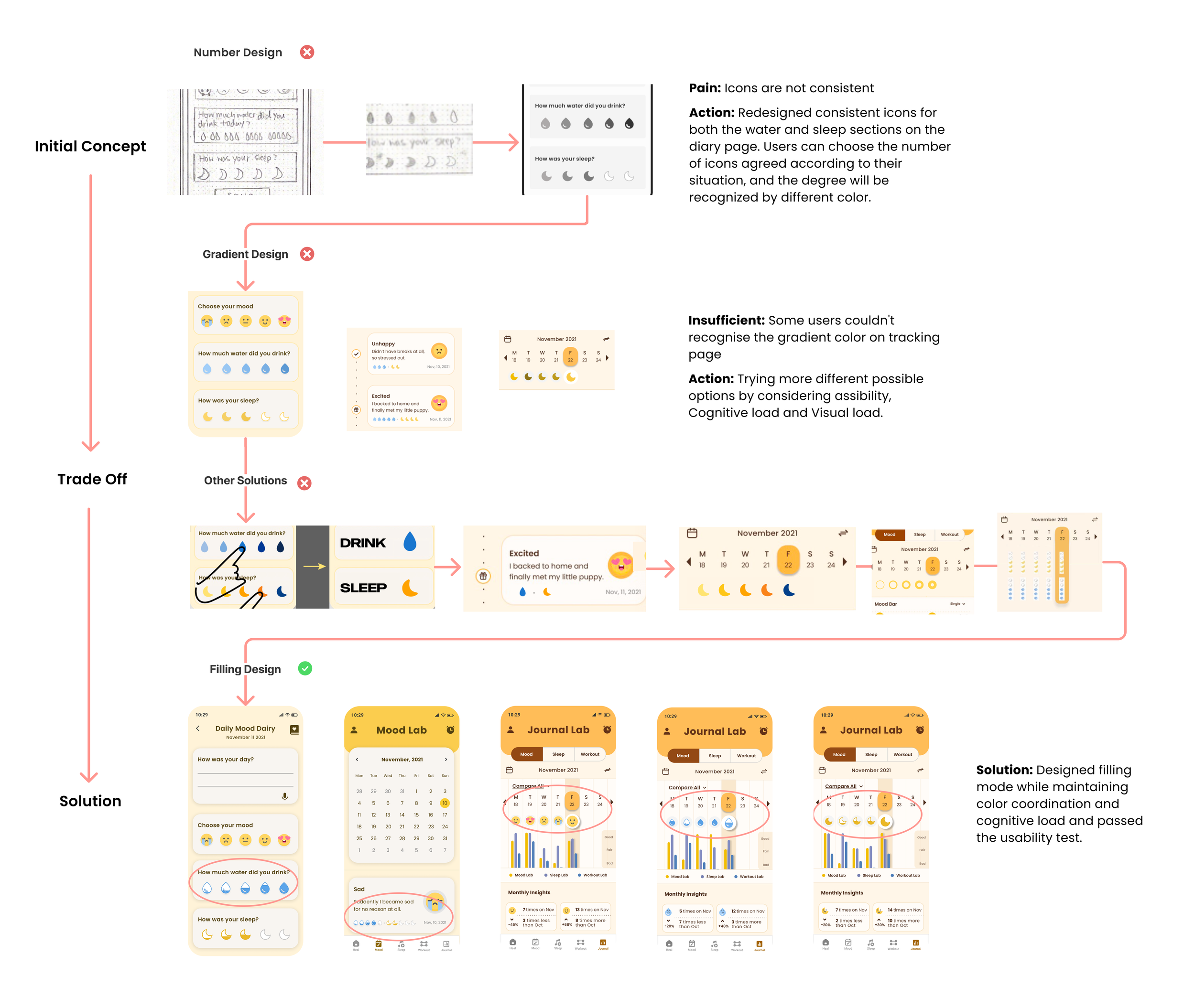 To let users have a more comprehensive understanding of their state, they can quickly select their mood, water amount, and sleep quality. I found I needed to think from three perspectives: accessibility, usability, and visual appeal(aesthetics) to help users recognize what they chose on the diary page, mood card, and tracking section as well. I got the final solution through different design schemes and trade-offs: