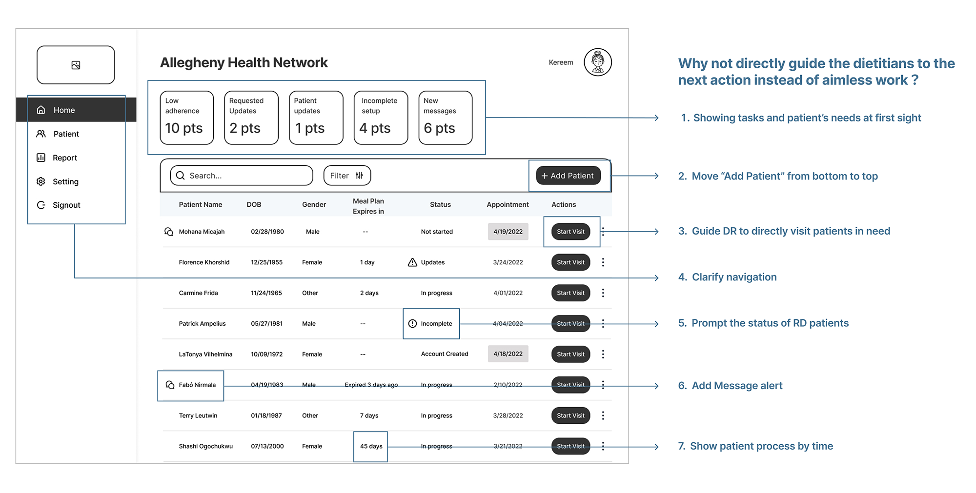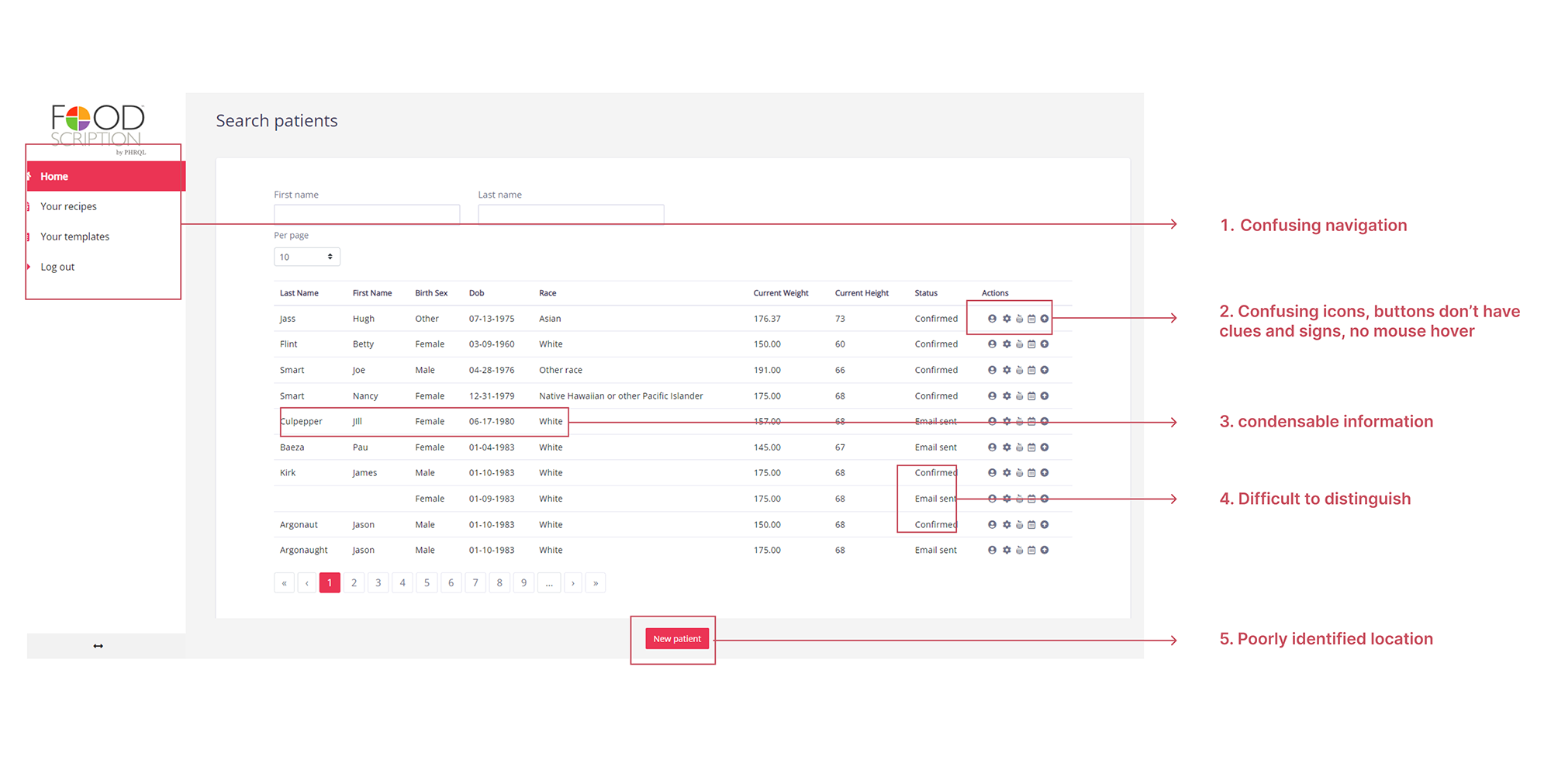 To identify the user needs, I started with the current product audit, and then we conducted interviews with five dietitians to explore their work processes. I performed usability evaluations of the existing product and identified the pain points they encountered. We discovered that the deficiency of the dietician tool adversely affected the patient experience. Therefore, we prioritized the following key issues from different stages to redesign the product.